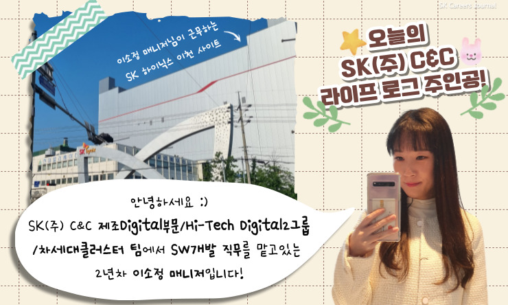 사실 오늘 밀착 취재를 진행할 예정이어서 이소정 매니저님의 회사 생활을 가까이서 보여드리고 싶었는데요, 세상에! 현재 이소정 매니저님이 근무하시는 이천 SK(주) C&C는 보안이 철저해서 아무래도 회사 내부 생활에 대해 자세히 보여 드리긴 어려울 것 같아요…8ㅅ8