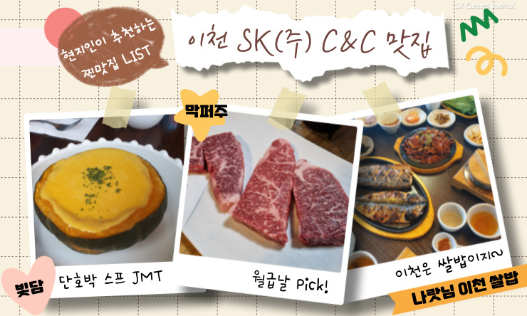 한식의 경우에는 호운, 나랏님이천쌀밥, 그리고 거궁을 추천하고 싶어요. 양식은 빛담, 나포리가든, 37.5을 추천해요! 특히 빛담의 단호박 스프는 진짜 맛있거든요! 일식으로는 호타루, 동카, 한끼정! 그리고 마지막으로 육식은 막퍼주, 피카소, 양찬하루를 추천합니다! 막퍼주의 경우는 이천 사이트에 근무하는 SK 임직원들이 월급날 꼭 들르는 곳이랍니다!ㅎㅎ