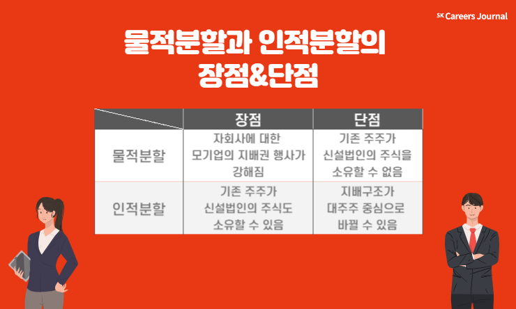 물적분할과 인적분할 중 어느 방법이 더 좋다고 단정짓기는 어렵습니다. 각각의 방법마다 일장일단이 있기 때문이죠. 물적분할은 기존 주주들에게 조금 불리할 수 있지만, 존속법인이 신설법인에게 강력한 지배권을 행사할 수 있습니다. 반면에 인적분할은 존속법인이 아닌 기존의 대주주가 신설법인에게 더 큰 영향력을 행사할 수도 있습니다. 물적분할을 하더라도 신설법인의 전망이 밝고, 존속법인과의 연계를 통한 사업 진행이 순조롭게 이뤄진다면 더 큰 성장효과를 누릴 수 있는 것이죠. 즉, 무조건 인적분할이 좋다고 단정하기는 어려우며, 그 반대의 경우도 마찬가지입니다.