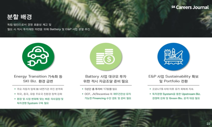 이 페이지의 핵심은 다음과 같습니다. “1) 효율적인 경영을 위해, 2) 필요한 만큼의 자금을 빠른 시간 안에 확보하기 위해 사업 분할을 추구하였다.” SK이노베이션이 배터리, E&P 사업을 분사한 이유와 향후 분사일정, 기대효과 등의 내용을 다루고 있기 때문에 SK이노베이션 취업을 희망하시는 분들이라면 꼭 읽어 보셔야 할 자료 중 하나이죠. 그런데 막상 정독하려고 자료를 살펴보면 용어가 너무 어려워서 눈에 잘 들어오지 않습니다. 정보를 검색해봐도 설명이 다소 딱딱하다고 생각하진 않으셨나요? 그래서 준비했습니다! SK이노베이션의 물적분할 이슈를 이해하기 위해 꼭 알아야 할 내용들을 쉽게 풀어서 설명해드리는 이번 기사! 지금 시작합니다~~!! J