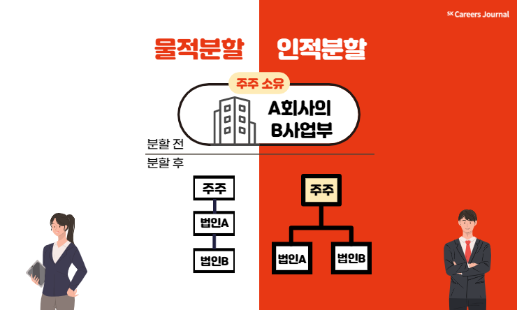 기업분할은 인적분할과 물적분할로 구분되는데, 가장 큰 차이점은 ‘주주가 신설법인의 주식을 가질 수 있는지 없는지’ 입니다. 한경 경제용어사전의 정의에 따르면, 인적분할은 기존회사 주주들이 지분율 대로 신설법인의 주식을 나눠 갖는 방식의 기업 분할 형태입니다. 반면 물적분할은 모회사의 특정 사업부를 신설회사로 만들고 이에 대한 지분을 100% 소유해 지배권을 행사하는 형식의 기업 분할입니다. 인적분할은 사업부가 분리되어도 분할비율만큼 주주들에게 신설회사의 주식이 배분되지만, 물적분할의 경우 주주는 분할된 회사의 주식을 받을 수 없습니다.