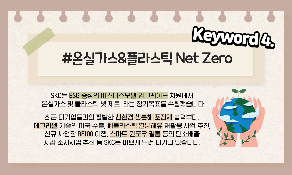 네 번째 키워드는 바로, 전부 나열하기도 힘들 정도로 정말 수~많은 사업이 진행되고 있는 SKC의 친환경 사업과 관련된 비전! “온실가스 및 플라스틱 넷 제로(Net Zero)”입니다! SKC는 ESG 중심의 비즈니스모델 업그레이드 차원에서 이를 장기 목표를 수립하여 적극적으로 실현해 나가고 있습니다. 최근 CJ제일제당, SPC그룹과의 친환경 포장재 협력부터 에코라벨 기술의 미국 수출, 일본 벤처회사와의 협력으로 본격 추진되고 있는 폐플라스틱 열분해유 사업 등, SKC는 바쁘게 달려나가고 있습니다. 그리고 앞으로도 이러한 친환경 생분해 소재 사업과 재활용 사업을 적극 추진하는 동시에 스마트 윈도우필름 등 탄소배출 저감 소재사업 역시 확장하고, 신규 사업장은 RE100을 기본으로 이행하여 이산화탄소 배출량을 감축할 계획을 가지고 있습니다.