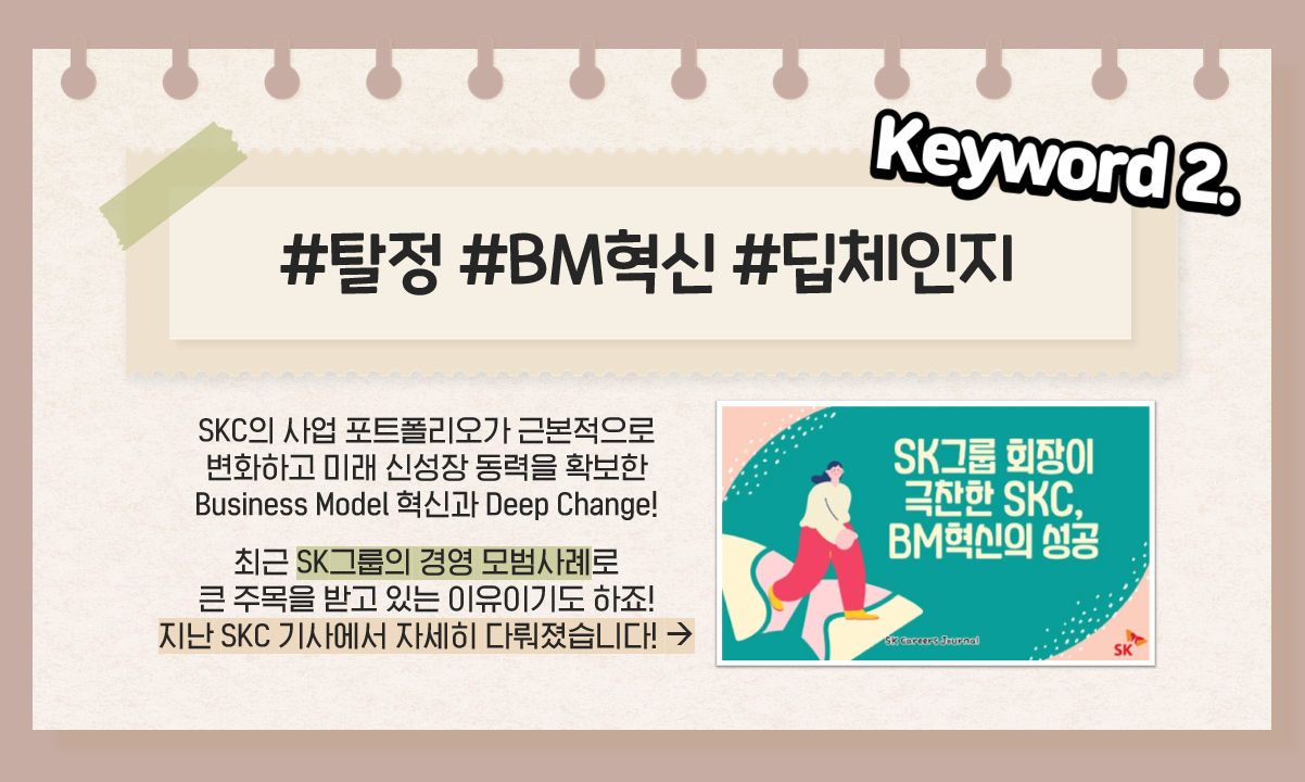 두 번째 키워드는 바로 최근 SKC의 가장 큰 변화이자 중요한 이슈이기도 하죠! “탈정(脫井·갇혀 있는 우물에서 벗어나다)” 선포와 몇 년에 걸친 성공적인 “BM(Business Model)혁신”과 “딥체인지(Deep Change)”의 실현! 40년 넘게 대한민국 소재산업을 선도해온 SKC는 BM혁신을 통해 기존 필름·화학 제품 중심의 기업에서 벗어나 모빌리티·반도체·친환경 소재 중심의 고부가가치 소재회사로 성공적으로 도약했습니다. 이처럼 사업 포트폴리오의 근본적 변화와 미래 신성장 동력을 확보한 BM혁신과 딥체인지는 최태원 회장이 지속적으로 강조해온 SK그룹의 화두이자 경영철학의 실현으로, 최근 SKC가 SK그룹의 경영 모범사례로 큰 주목을 받고 있는 이유이기도 합니다! 이와 관련된 내용은 지난 SK Careers Journal의 SKC 기사 <SK그룹 회장이 극찬한 SKC, BM혁신의 성공>에서 자세히 다뤄졌습니다 :)