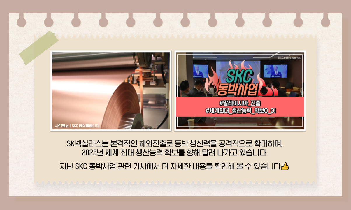 특히 SK넥실리스는 최근 급격히 성장하는 동박 산업과 수요에 발맞춰 공장의 추가 생산가동을 빠르게 확대하고 있으며, 해외진출을 본격화하여 동박 생산력을 공격적으로 늘려 나가고 있습니다. 이를 통해 SKC는 2025년 동박 세계 최대 생산능력을 확보한 기업으로 발돋움 하고자 합니다. 동박사업 관련 내용 역시 SK Careers Journal의 지난 SKC 기사 <SKC 모빌리티 동박사업, 해외진출 본격화로 세계 최고를 향하다!> 기사에서 더 자세히 확인해볼 수 있습니다👍