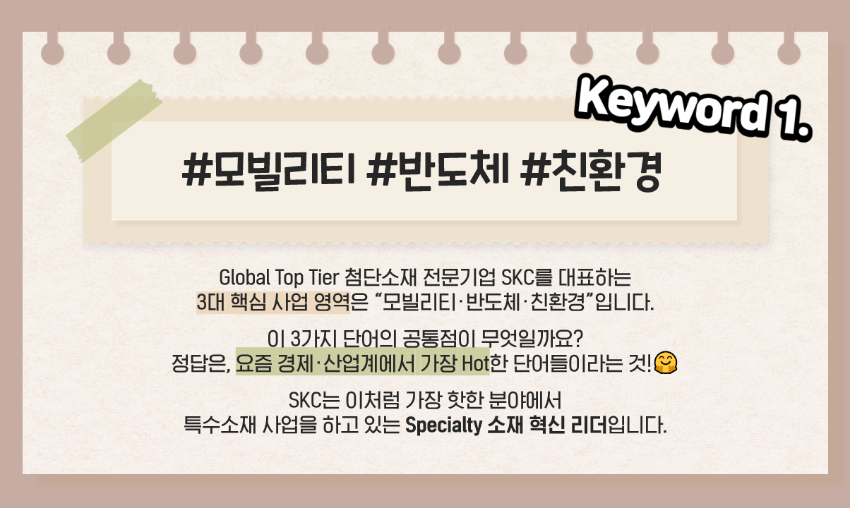 첫 번째 키워드는 뭐니 뭐니 해도 바로, SKC 하면 바로 떠오르는 “모빌리티·반도체·친환경”!