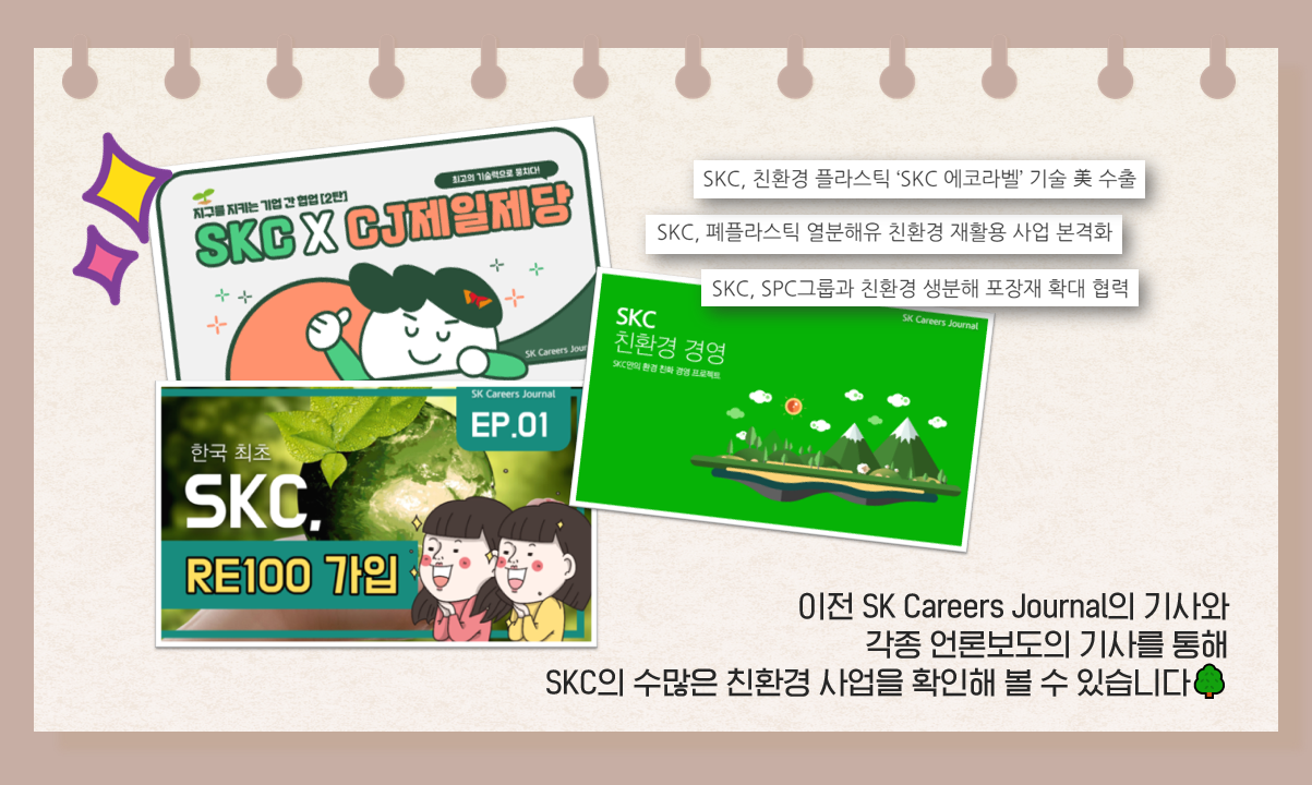 “온실가스 및 플라스틱 넷 제로(Net Zero)”를 향해 나가는 SKC의 다양한 행보 역시 지난 SK Careers Journal의 수많은 기사와 각종 언론 보도들을 통해 더 자세히 확인해 볼 수 있습니다 :)