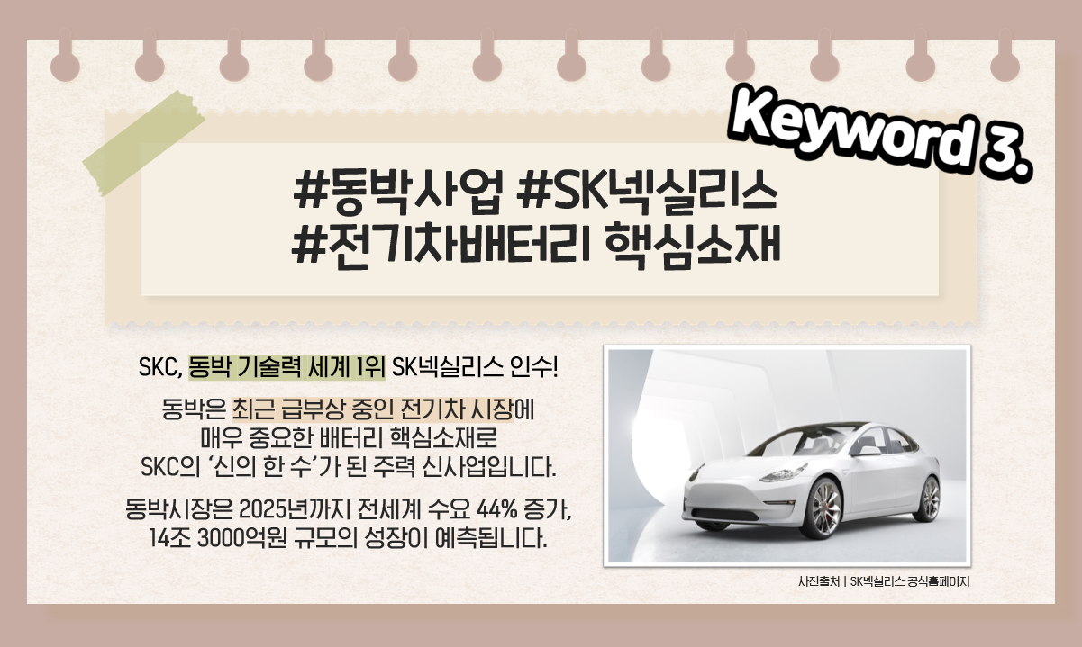 세 번째 키워드는 바로 SKC의 ‘신의 한 수’로 불리는 새로운 주력 핵심 사업이자 경제·산업계의 핫이슈 “동박사업”입니다! 2025년까지 무려 14조 3000억원 규모로 성장할 것으로 예측되는 동박시장! 동박은 최근 급부상하고 있는 전기차 시장에 매우 중요한, 전기차 배터리의 핵심소재입니다. 얇은 구리 막 형태를 띠고 있으며, 전기차 배터리의 음극집전체로 쓰이는 2차전지용 소재입니다. 현재 수많은 거대 기업들이 어마 무시한 미래 신성장 동력을 가진 배터리 소재 시장에서 우위를 차지하기 위해 사활을 건 경쟁을 벌이고 있는데요, SKC는 빠른 판단력과 추진력으로 이전 2019년 “세계 1위의 동작 제조 기술력”을 보유한 현 “SK넥실리스”를 100% 투자사로 인수하며 동박사업에서 선도 기업으로 달려 나가고 있습니다.