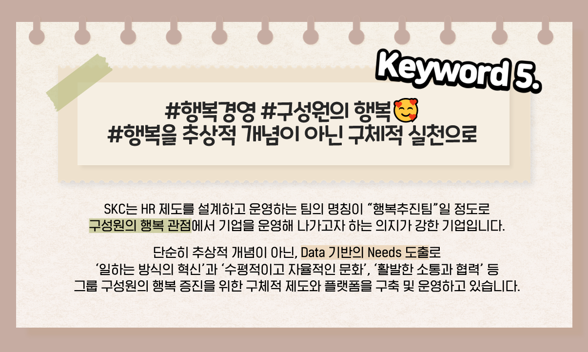 아무리 기업의 사업 실적이 좋아도 정작 구성원은 불행하다면 슬프겠죠?🥺 마지막 다섯 번째 키워드는 기업의 대외적 사업 만큼이나 무척 중요한 SKC 기업의 내부와 관련된 키워드입니다. 바로, 구성원의 행복을 최우선으로 생각하는 SKC의 “행복경영”입니다. SKC는 흔히 많은 기업들에서 ‘HR팀’, ‘인사팀’으로 불리는, 다양한 HR 제도를 설계하고 운영하는 팀의 명칭이 “행복추진팀”일 정도로 구성원의 행복 관점에서 기업을 운영하고자 하는 의지가 강한 기업입니다.