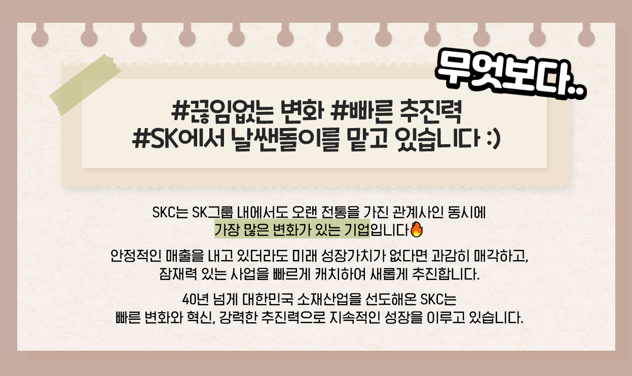 계속 더 새로워지는 기업, 변화하고 성장하는 기업 SKC! 앞으로도 SKC가 만들어 나갈 대한민국의 미래 소재산업이 정말 기대되고, SKC 입사를 꿈꾸는 많은 취준생 분들의 꿈이 이뤄질 수 있기를 간절히 바라는 마음입니다🥺