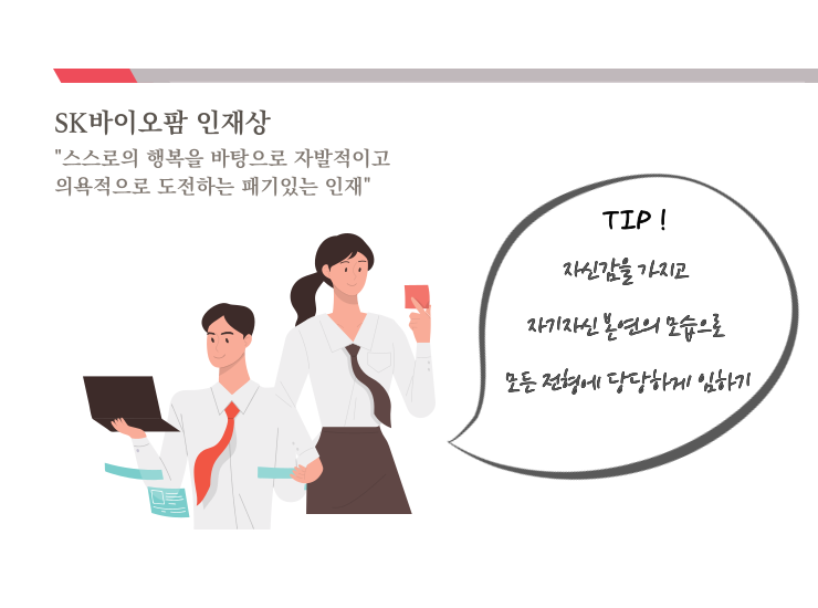 SK바이오팜의 인재상은 ‘스스로의 행복을 바탕으로 자발적이고 의욕적으로 도전하는 패기있는 인재’ 입니다. 많은 취업 준비생 분들이 회사의 인재상에 맞춰 채용 전형을 준비하고 계신데요, 솔직하고 당당한 자신의 모습을 보여주시는 것에 더 집중하신다면 합격에 한발짝 가까이 갈 수 있다고 생각합니다. 회사 인재상에 자신을 맞춰 다른 사람이 되려고 노력하다 보면 그 과정 중 오히려 부작용이 생길 수 있는데요, 채용 전형에서 부자연스러운 모습이나 실수를 범하지 않기 위해서는 자신감을 가지고 자기자신 본연의 모습으로 모든 전형에 당당하게 임하는 것이 합격을 향한 지름길이라고 생각합니다.
