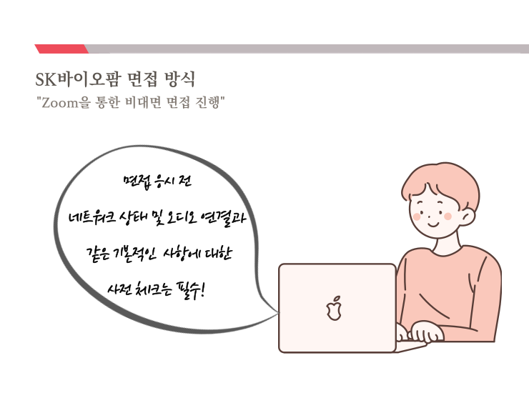 SK바이오팜에서는 현 코로나 상황을 고려하여 모든 면접은 온라인 방식의 비대면 면접으로 진행하고 있습니다. 많은 분들에게 온라인으로 진행되는 비대면 면접 방식이 다소 생소하게 느껴질 수도 있지만 연습을 통해 긴장감을 줄이고 익숙해 지신다면 좋은 결과가 있을 것이라 생각합니다. 기본적이지만 중요한 Tip을 드리자면, 면접 진행 시 통신 불량, 목소리 송수신 불량 등 예상치 못한 문제가 발생할 수 있으니 면접 시작 전 네트워크 상태 및 오디오 연결과 같은 기본적인 사항에 대한 사전 체크를 진행해주시면 큰 도움이 되답니다.
