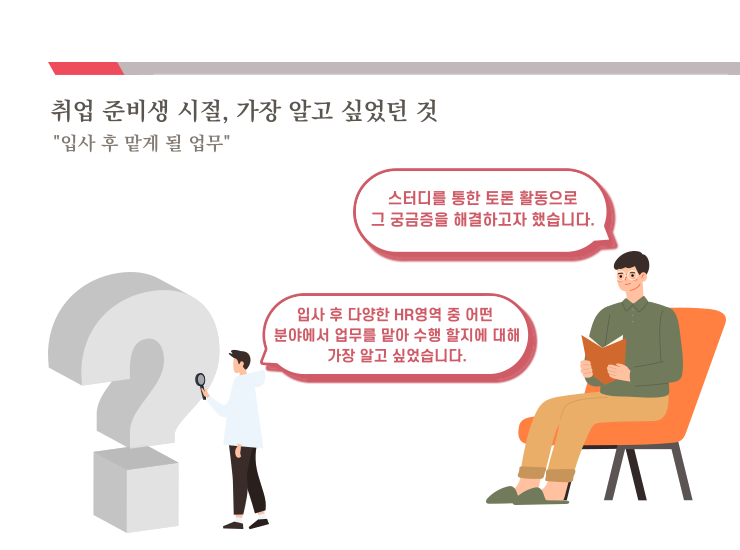 저는 취업 준비를 시작하면서 HR직무 관련 서적을 읽고 이에 대한 내용을 스터디 그룹원들과 함께 토론해보는 시간을 종종 가졌는데요, ‘구글의 아침은 자유가 시작된다’는 책을 통해 구글의 성공 요인들 중 가장 큰 요소가 기업에 맞는 최적의 인재 선발이라는 사실을 알게 되었습니다. 그 이후로 기업의 미래 성장 동력을 발굴하는 채용 업무에 대한 꾸준한 관심을 바탕으로 열심히 입사 준비를 했고, 입사 후에는 그토록 원하던 채용을 맡게 되어 현재 굉장히 만족스러운 회사 생활을 이어나가고 있습니다.