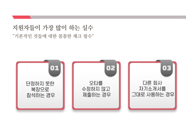 또, 타회사의 자기소개서를 그대로 복사해서 회사 이름조차 변경하지 않고 제출하는 경우가 많았던 것 같습니다. 지원자분들께서 조금 더 꼼꼼히 여유를 가지고 준비해주시길 당부 드립니다.