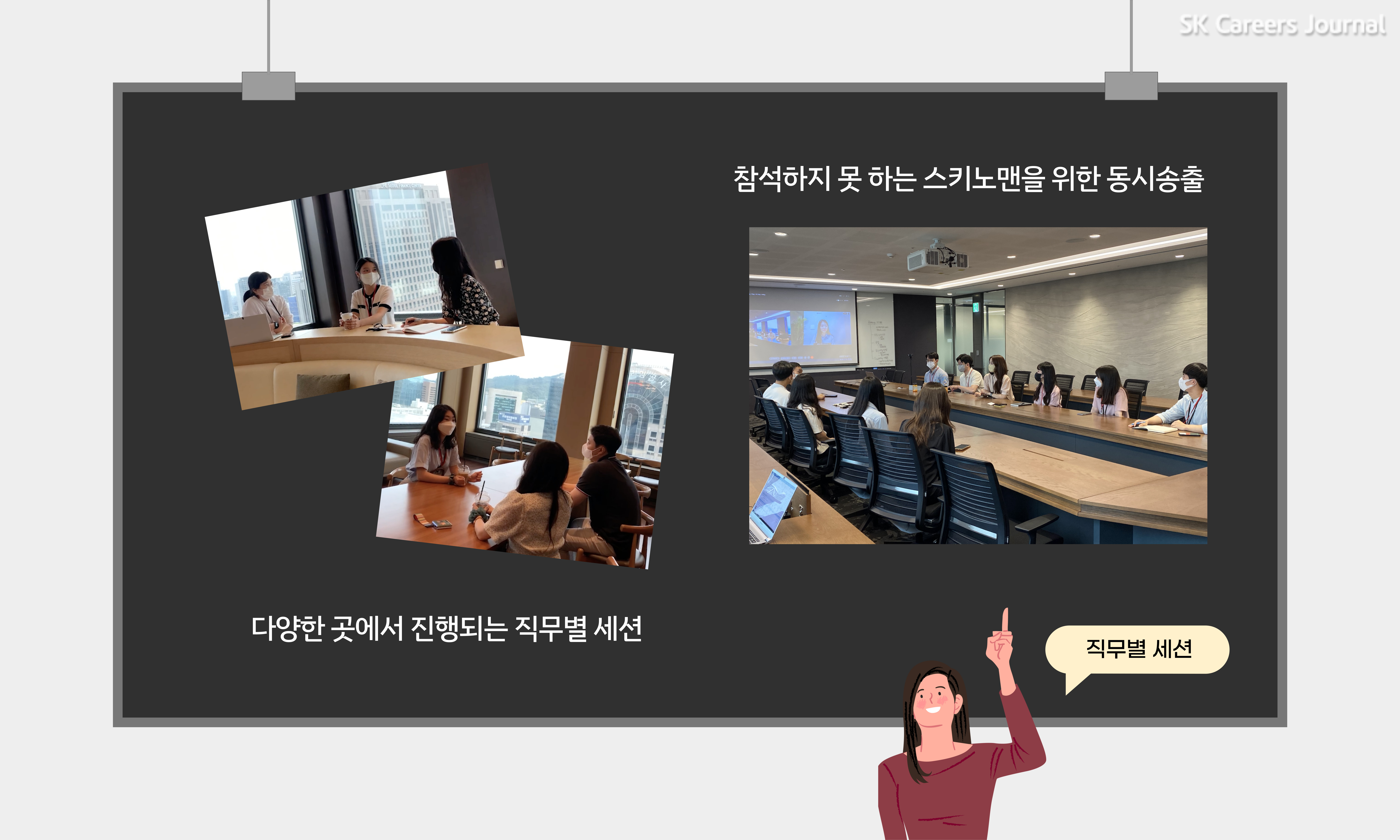 이후 퀴즈가 끝난 후에는 신입사원들은 직무별로 흩어져 멘토님들과 함께 직무별 세션에 참여했는데요. 실제 입사 후 어떤 실무를 착수하게 되는지 멘토님의 설명뿐만 아니라 사회생활 선배님들이 전해주는 회사 생활 전반적인 꿀TIP들까지! 뿐만 아니라 서산에서 근무하게 될 스키노맨들을 위해서는 주거는 어떻게 해결해야 하는지 등 다양한 TIP들을 전수해주셨습니다.