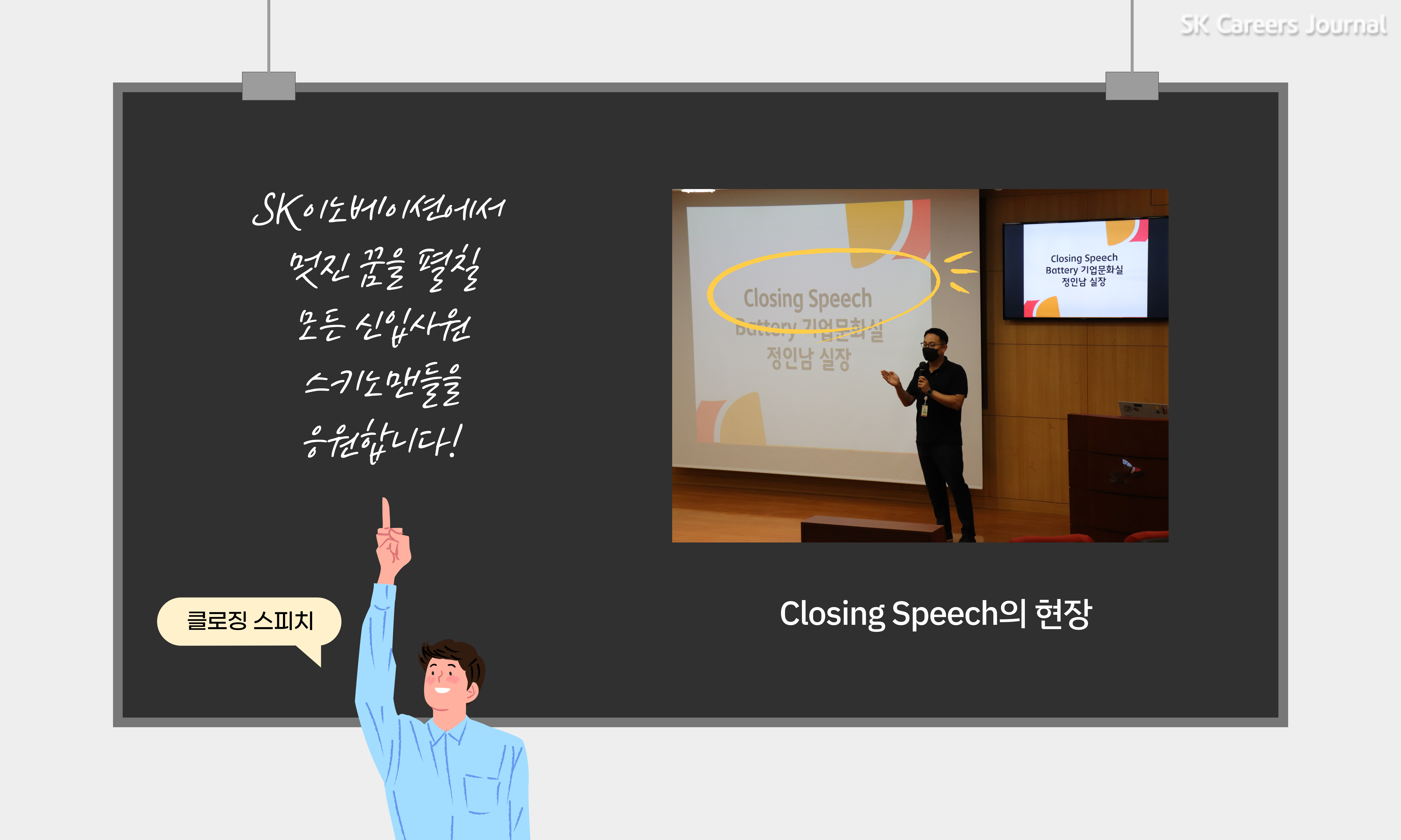 직무별 세션이 끝난 스키노맨들, 다시 3층 SUPEX Hall에 모여 향후 신입사원 교육 일정에 대해 안내 받습니다. 안내가 끝난 후, 드디어 오리엔테이션의 마지막 일정, Battery 기업문화실 정인남 실장님의 클로징 스피치로 2021년 하반기 신입사원 OT가 막을 내립니다!