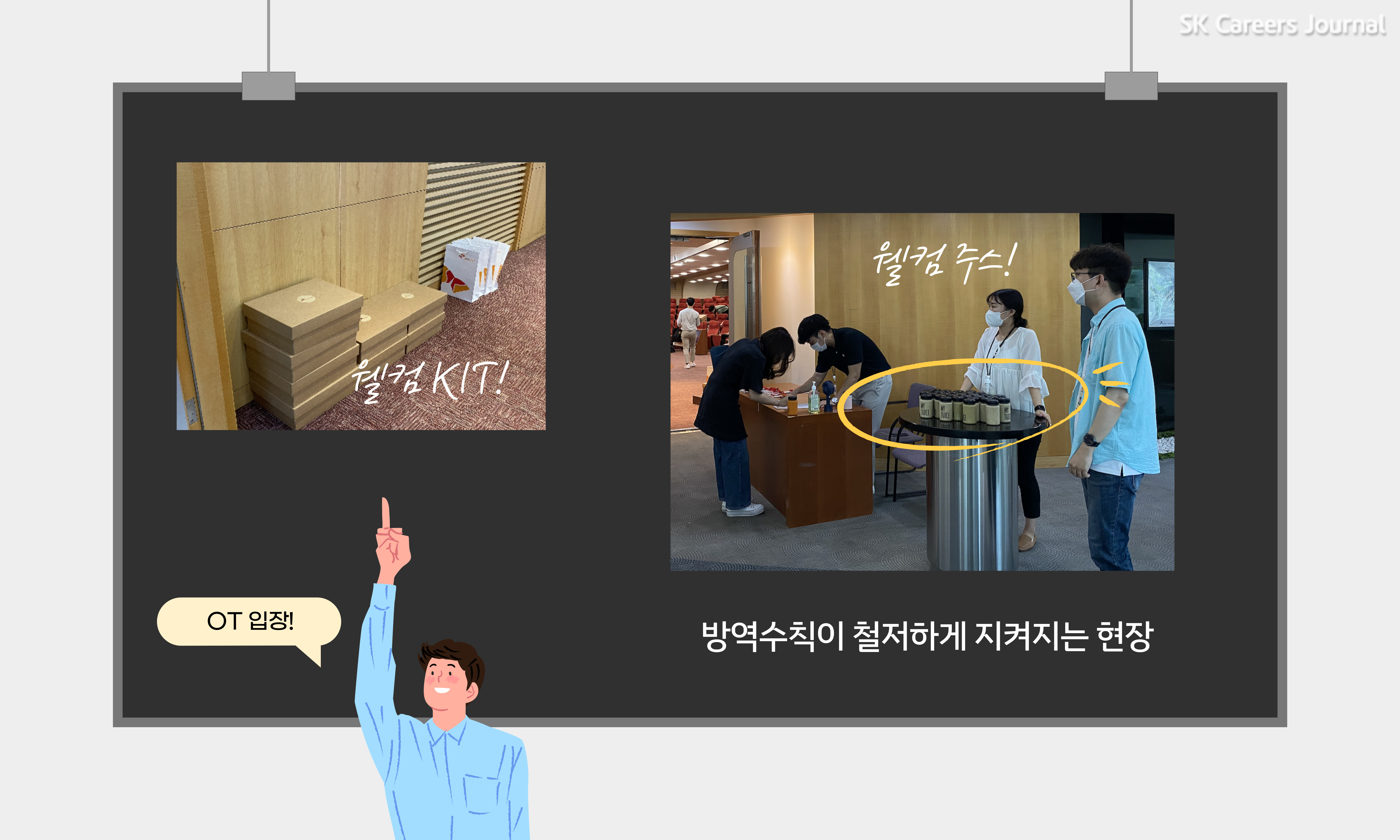 저, 스키노 JR은 7월 9일, 신입사원 OT 마지막 날, 현장 습격을 위해 SK서린빌딩에 방문하였습니다. 대면으로 오리엔테이션이 이루어진 만큼 방역 수칙을 철저하게 지키고 있는 모습도 확인할 수 있었는데요. 신입사원들은 1층 입구에서 발열 체크와 방문자 명단을 작성한 뒤, 3층으로 올라와 손 소독을 한 후 SUPEX Hall에 입장하였습니다. 입장 전, SK이노베이션에서 준비한 웰컴 KIT와 주스를 챙기는 건 필수!