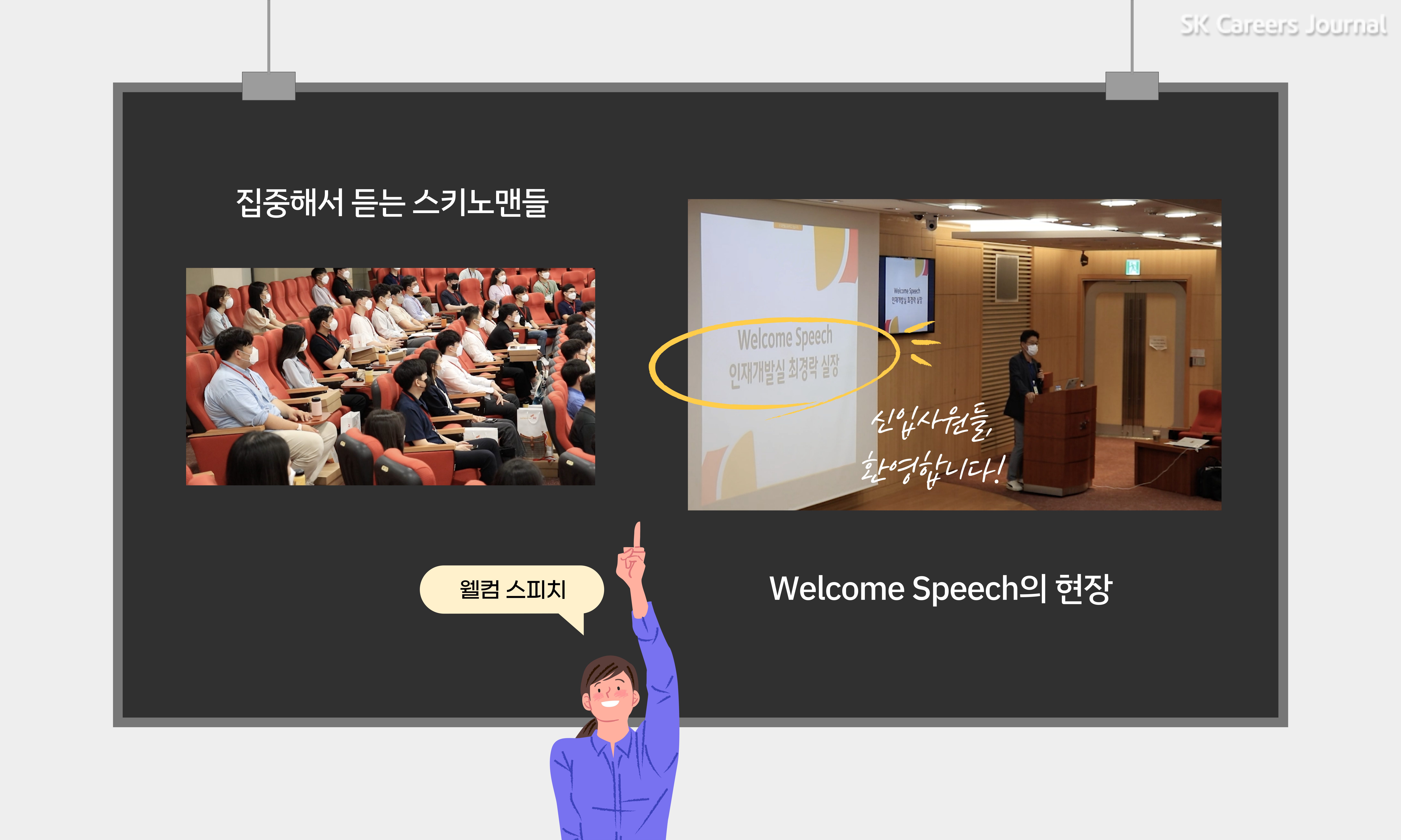 차례 차례 입장을 마치고 자리에 착석한 신입사원들, 긴장되어 보이네요. 긴장의 적막을 깨고 오리엔테이션이 시작되었습니다! 오리엔테이션은 인재개발팀 최경락 실장님의 Welcome Speech로 시작되었는데요, 힘든 취업 과정을 헤치고 스키노맨이 된 것을 진심으로 축하하면서 SK이노베이션 선배로서 좋은 이야기를 해주셨습니다.