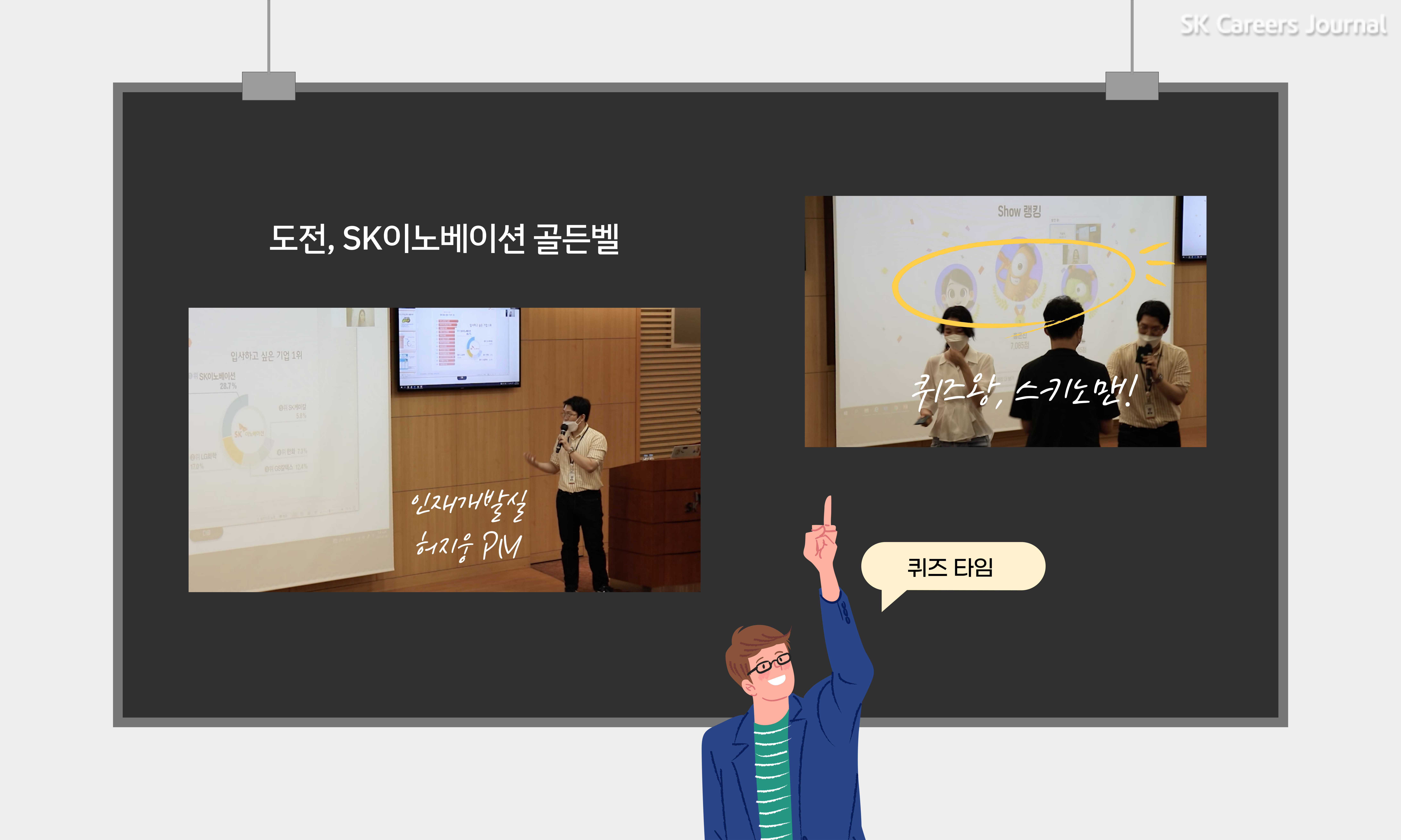 이렇게 선배 스키노맨들의 열렬한 환영을 받은 후, 기업문화를 소개하는 시간이 이어졌습니다. 그냥 소개하면 재미없잖아요? 그래서 인재개발실에서 준비한 퀴즈, 도전! SK이노베이션 골든벨! 치열한 경쟁률을 뚫고 당당히 스키노맨이 된 만큼 신입사원 스키노맨들이 SK이노베이션을 얼마나 잘 알고 있을지 궁금한데요! 골든벨에서 어떤 문제가 나왔는지 조금 알려 드릴 테니, 이 글을 보고 계신 스키노 JR들도 한번 맞혀보세요~