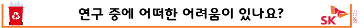 폐자원을 활용한 소재를 개발하고 있기 때문에, 기존의 신규 소재 연구 개발과는 다른 여러가지 예상치 못한 문제들이 발생합니다. 몇 가지 예를 들자면, 수거되는 폐 플라스틱의 품질이 균일하지 않기 때문에, 최종 제품 개발의 품질이 균일하지 않을 수 있다는 부분이 기존 연구 진행과는 달라서 예상하지 못했던 부분이었네요. 그래도 그런 예상하지 못한다는 점이 연구 업무의 즐거움 포인트 인 것 같아요.