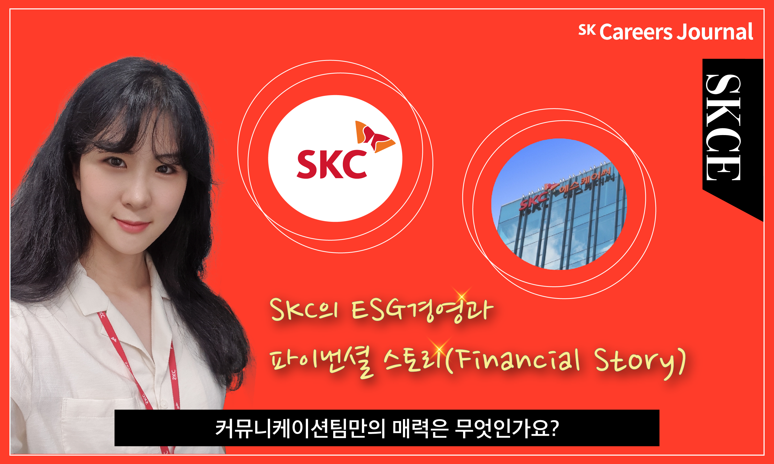 커뮤니케이션팀의 매력은 일단 제 성격과 부합한다는 점입니다. 혹시 MBTI 아시나요? 제가 ENFP 유형에 해당하는데요(웃음) 저는 좋아하는 것이 생기면 주변에 공유하는 것을 즐기는 성격입니다. 현재 직무가 딱 그런 포지션에 해당한다고 생각해요. SKC의 ESG경영도 그렇고 파이낸셜 스토리도 그렇고, 외부에 자랑스럽게 알리는 역할이니까요.