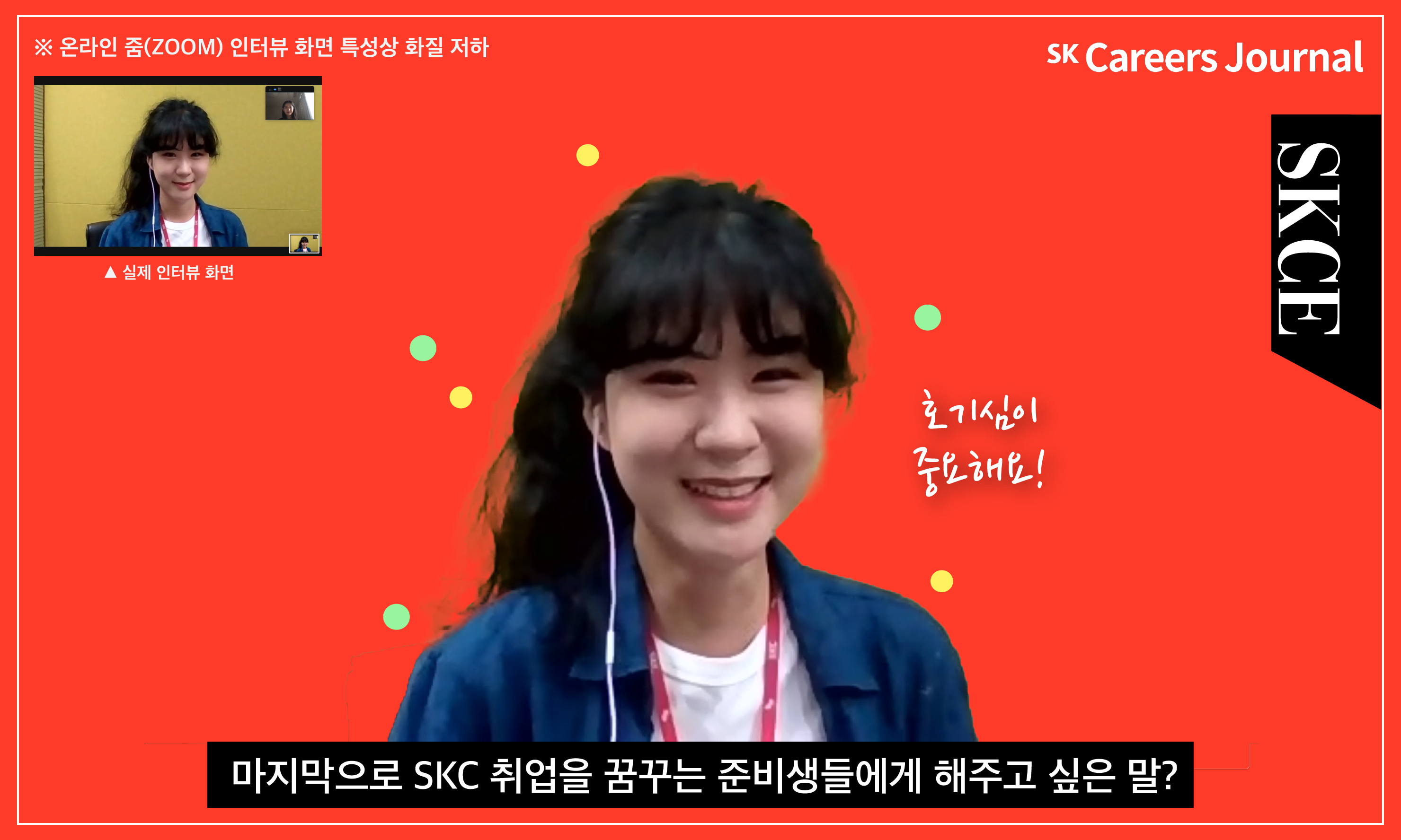 지금까지 SKC 커뮤니케이션팀 소속 이지은 매니저님과의 인터뷰였는데요. 어떠셨나요? 정말 핵심들만 쏙쏙 담긴 주옥같은 답변들을 남겨주셔서 독자 여러분께 도움이 많이 될 것 같습니다. 같은 문과생인 저도 커뮤니케이션팀뿐만 아니라 SKC에도 호기심이 생기고 매력적으로 느껴지는데요! 취업을 꿈꾸시는 모든 분들, 파이팅하셨으면 좋겠습니다. 바쁘신데도 불구하고 인터뷰에 흔쾌히 응해주신 이지은 매니저님께 감사 인사를 전하며 마칩니다. 그럼 다음시리즈에서 만나요!