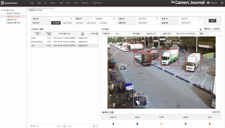 일상 속의 CCTV 영상에서 차량이 몇 대나 있는지 차량 종류별로 몇 대가 이동하고 있는지를 확인해서 그 구역의 물류 장비 이동 현황 및 주정차 위반 현황을 확인할 수 있습니다.