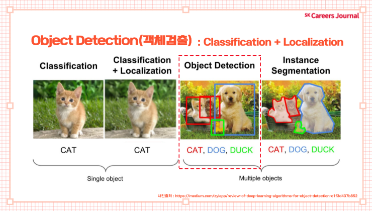 상단의 이미지를 통해 CNN의 경우 이미지 당 하나의 결과가 나오지만 Object Detection의 경우 여러 피사체를 Detection(탐지) 해서 여러 개의 분류 결과가 나온다는 것을 확인하실 수 있습니다.