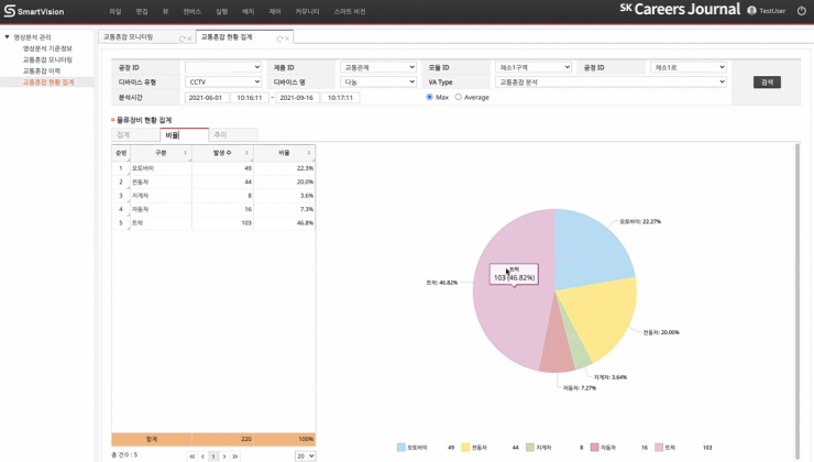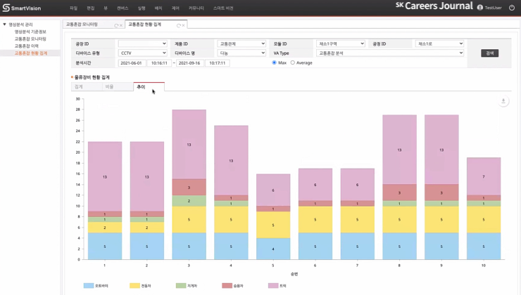 현황 집계 화면에서 일자별, CCTV별 물류 장비 현황의 집계, 비율, 추이를 확인할 수 있습니다.