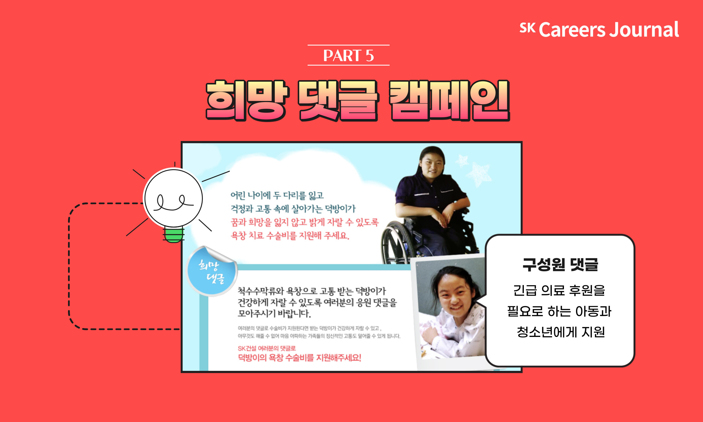 마지막으로 소개해드릴 활동은 2012년 6월에 시작된 희망 댓글 캠페인입니다. 매월 당사 구성원의 응원 댓글을 모아 긴급 의료 후원을 필요로 하는 아동과 청소년에게 지원하고 있습니다. 국내 아도 외에도 케냐, 필리핀 등 빈민촌 아동의 긴급한 수술 의료비를 지원하는 등 해외로 그 대상을 확대하였습니다. 매월 초 사내 인트라넷에 긴급 후원이 필요한 대상자 사연을 공개하고, 구성원이 응원 댓글을 달면 한 건당 2,000원의 기부금이 회사 매칭 펀드로 지원되는 방식입니다. 2020년 12월까지 103회의 캠페인을 통해 누적 20만 917명이 참여하였고, 누적 금액 총 4억 183만 4,000원을 달성하였습니다.