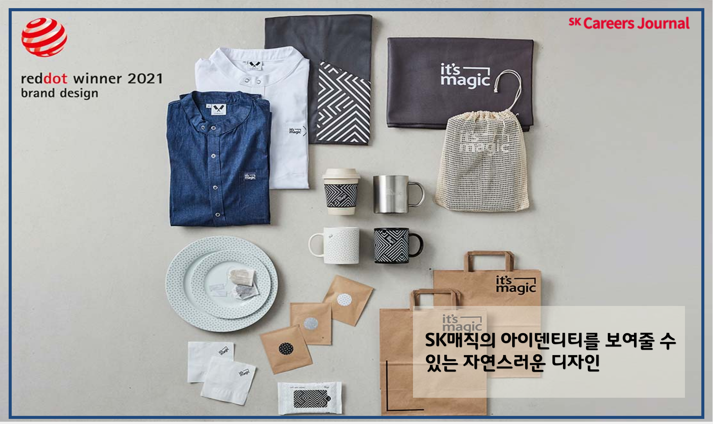 이번 잇츠매직(It’s magic) 패키지는 유니폼, 앞치마, 컵과 접시 등의 제품들로 구성되어 있는데요. 사람과 사람, 사람과 공간, 사람과 브랜드를 이어주는 SK매직만의 차별화된 브랜드 가치가 담긴 에지 형태의 선인 ‘매지컬 엣지(magical edge)’로 이루어진 패턴이나 프레임에는 다양한 컬러나 면이 존재하지 않기 때문에, 인쇄 시 많은 비용을 절감할 수 있어 지속 가능한 경영 측면에서도 매우 긍정적입니다. 이번 디자인은 기존 SK매직의 컬러와 아이덴티티를 배제하고, 모던하고 세련된 톤 앤 매너로 통일되고, 정제된 브랜드 이미지를 고객에게 전달한 점이 높이 평가받았다고 하네요!