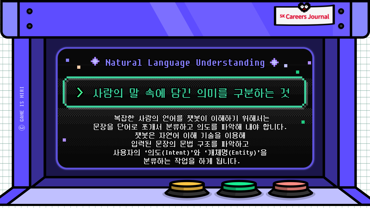 인공지능형 챗봇이 복잡한 질문에 대한 응답을 하고 자기학습이 가능한 챗봇이라면 시나리오형 챗봇은 미리 설정된 단어에 따라 정해진 답을 구현하는 방식의 챗봇이랍니다. AI Studio for Chatbot 솔루션은 인공지능형 챗봇입니다.