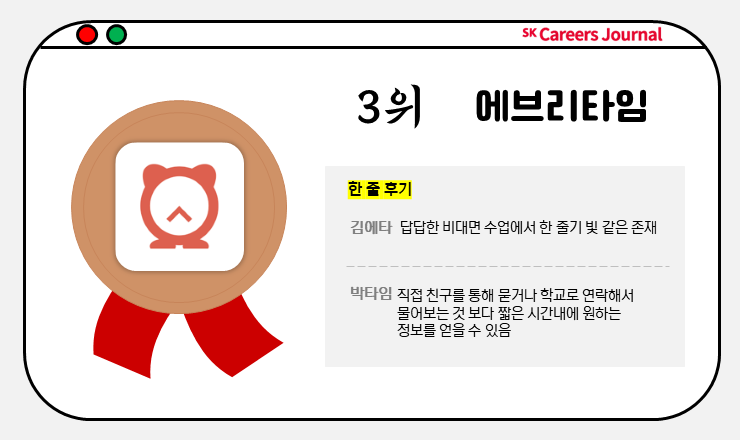 먼저 3위는 에브리타임입니다. 비대면으로 인해 학교 구성원들과 활발하게 소통하기 어려운 상황에서, 커뮤니티의 기능이 필요하신 분들께 꼭 필요한 어플인데요. 비대면이라 혼자 듣는 수업이 벅차신 분들, 학교 시설 중 운영 중인 곳이 어디인지 궁금하신 분들 등등 모두 편하게 학우들과 이야기 할 수 있는 유용한 어플입니다!