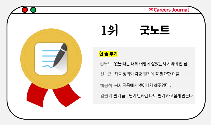 정말 쟁쟁한 후보들이었는데요. 3등은 에브리타임, 2등은 두 가지 스캔 어플, 캠스캐너와 Vflat, 마지막으로 대망의 1위는 굿노트가 차지했습니다. 다시 한번 귀한 시간 내어 설문조사에 참여해주신 대학생 여러분께 감사의 말씀을 전하며 대학생분들의 한 줄 후기를 들어보러 갈까요?
