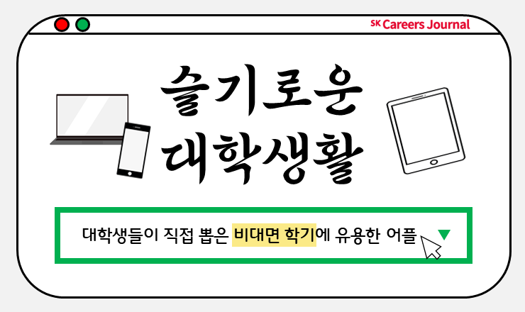 안녕하세요. 여러분! 지난 9월, 가을학기가 개강하고 다들 슬기롭게 대학 생활하고 계시는가요? 지난여름부터 악화된 코로나 상황이 지속되고 있어 수많은 대학이 비대면으로 가을학기를 진행하고 있다고 들었습니다. 비대면이 시작된 지 벌써 네 번째 학기라, 대학생 여러분들께서 많이 지치고 힘드실 것 같네요. 그래도 코로나에 지지 않고 이번 학기를 잘 마무리할 수 있도록 여러 대학생분들이 직접 사용해본, 비대면 학기에 유용한 어플을 선정해 주셨다고 합니다. 에디터와 함께 비대면 학기에 대학생들이 어떤 어플을 유용하게 사용했는지 살펴볼까요?