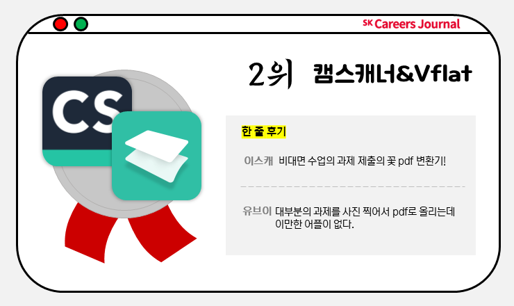 다음으로 2위는 바로 스캐너 어플인 캠스캐너와 Vflat입니다! 직접 과제와 시험지를 교수님께 제출할 수 없는 요즘, 스캔이 필수가 된 상황인데요. 휴대폰으로 스캔과 제출을 한꺼번에 처리할 수 있는 기특한 두 어플을 많은 대학생분들께서 추천해 주셨습니다.
