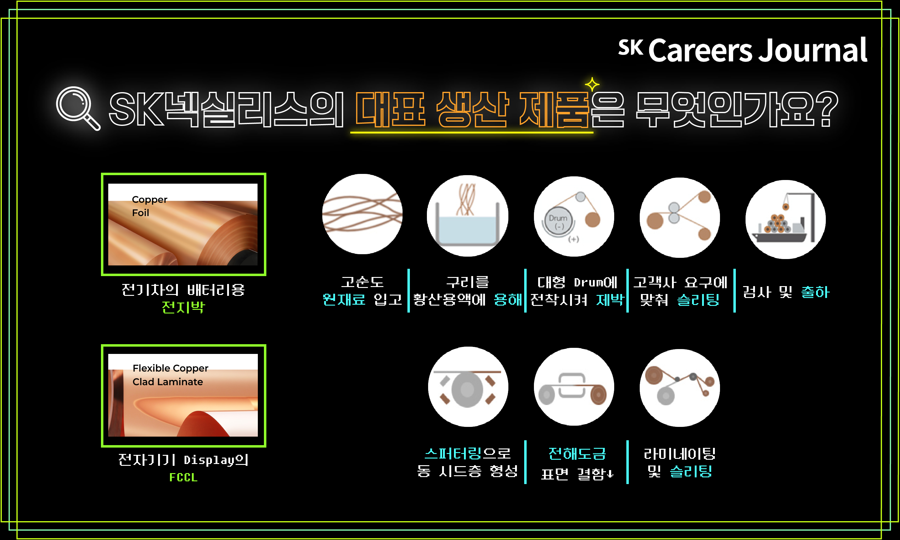 SK넥실리스는 1996년도부터 LG금속 동박사업부로 시작하여 전기차의 배터리(Battery) 주요 소재 중 음극집전체용 ‘동박’이라는 것을 생산하는 회사입니다. 2003년도에는 배터리에 들어가는 ‘전지박’을 개발하여 양산하기 시작했구요. 총 6년에 걸쳐서 세계 최초로 6μm(마이크로), 5μm, 4μm 전지박을 개발한 성과를 가지고 있습니다. 마이크로라는 단위는 머리카락보다 얇은 단위로 ‘동박’은 최대한 얇게 생산할수록 더 좋은 기술력을 가지고 있음을 뜻합니다. 이외에도 핸드폰과 노트북 등 IT기기의 Display에서 활용되는 FCCL(Flexible Copper Clad Laminate)도 생산 하고 있어요.
