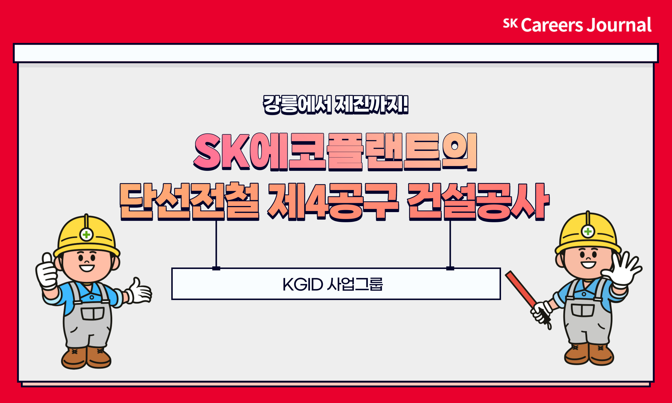 이번 공사에 관한 자세한 내용과 더불어, KGID사업그룹 입사를 꿈꾸는 분들께 도움이 될 좋은 말씀 전해주신 성낙근 프로님께 감사의 인사드립니다. SK에코플랜트는 지구를 위한 친환경 아이디어와 혁신 기술로, 공사 과정에서도 환경 훼손을 최소화하기 위해 노력하고 있습니다. 앞으로 진행될 프로젝트에도 많은 관심 부탁드립니다! 😊
