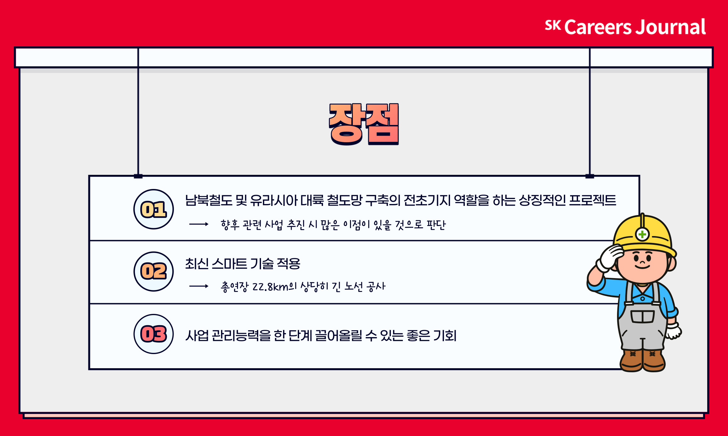 남북철도 및 유라시아 대륙 철도망 구축의 전초기지 역할을 하는 상징적인 프로젝트이기에, 향후 관련 사업 추진 시 많은 이점이 있을 것으로 판단됩니다. 또한 총연장 22.8km의 상당히 긴 노선 공사인 만큼 최신 스마트 기술이 적용됩니다. 이를 통해 사업 관리능력을 한 단계 끌어올릴 수 있는 좋은 기회가 될 것으로 생각됩니다.