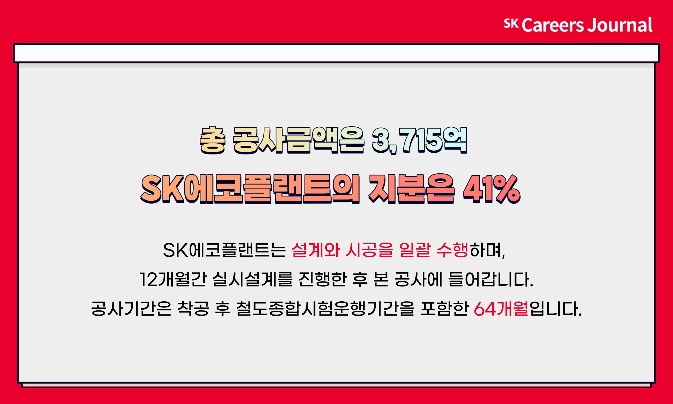 총 공사금액은 3,715억이며, SK에코플랜트의 지분은 41%입니다. SK에코플랜트는 설계와 시공을 일괄 수행하며, 12개월간 실시설계를 진행한 후 본 공사에 들어갑니다. 공사기간은 착공 후 철도종합시험운행 기간을 포함한 64개월입니다.