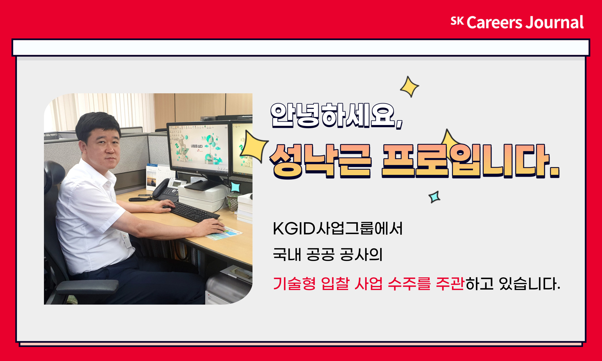 안녕하세요, SK에코플랜트 에코인프라부문 KGID사업그룹에 근무하고 있는 성낙근 프로입니다. 주요 업무로는 국내 공공 공사 중 ‘기술형 입찰 사업’ 수주를 주관하고 있습니다.