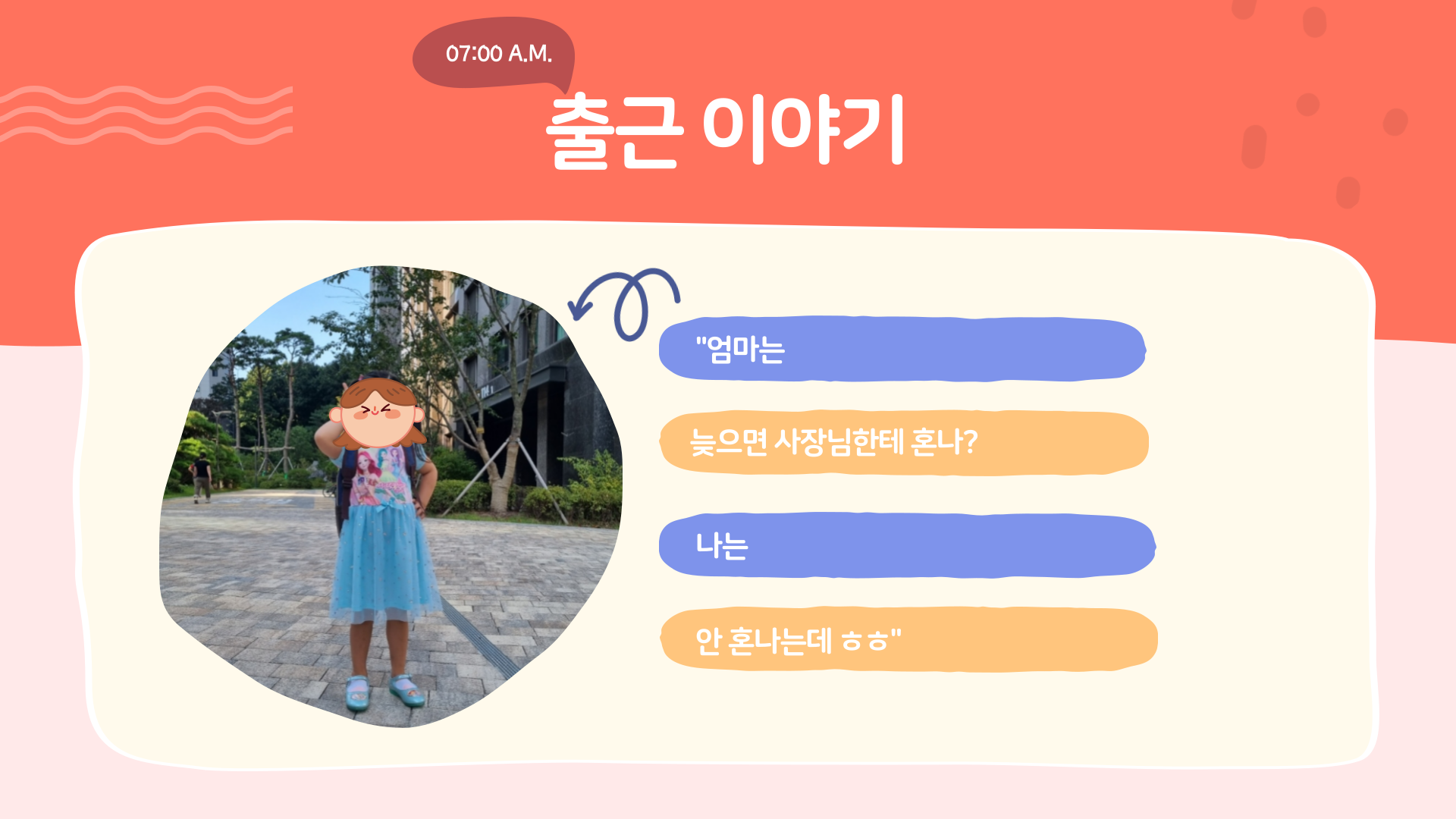 원래는 출근시간만 1시간이 걸렸는데, 가까운 곳에 이사 오면서 시간이 많이 단축되었습니다. 대신 아침에 어린이집을 빨리 보내야 해서 아기한테 항상 빨리빨리를 외치고 있습니다. 그럼 아기가 “엄마는 늦으면 사장님한테 혼나? 나는 안 혼나는데”라고 웃으면서 말하곤 하네요^^ 아! 물론 저희 팀장님은 혹여라도 제가 조금 늦어도 이해해 주십니다~! (팀장님 감사합니다!!)