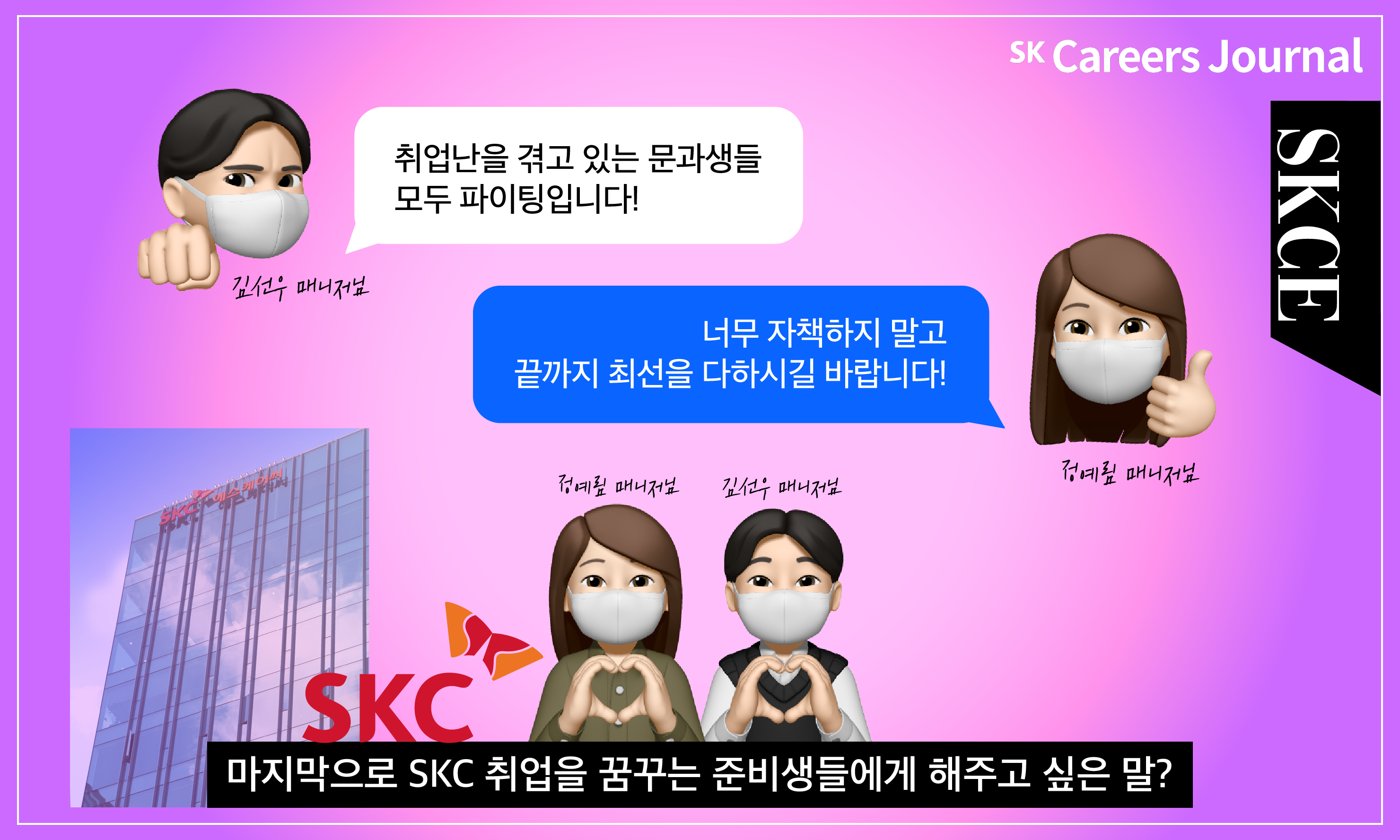 김선우 매니저님: SKC는 정말 일하기 좋은 회사고, 채용에 있어서도 문과 전공자들에게 열려 있는 편이니 꼭 도전해보셨으면 좋겠습니다. 아무쪼록 취업난을 겪고 있는 문과생들 모두 파이팅입니다! ☺️