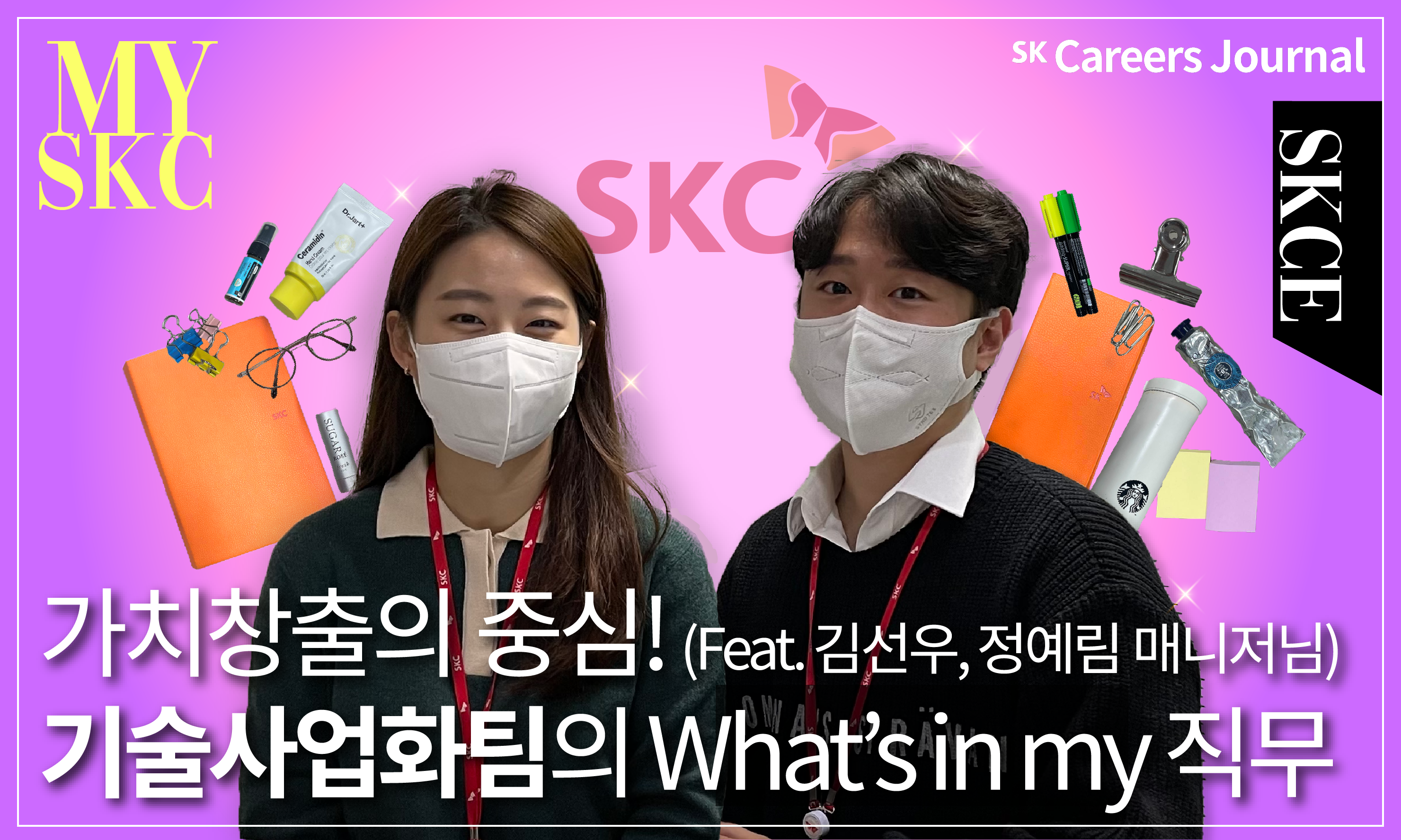 SKC의 기술사업화팀 안에는 무엇이 들어있을까요? 명칭 그대로 기술을 사업화하는 것에 focusing된 부서일 것 같다는 생각이 드는데요. What’s in my 직무! 문과 취업 시리즈 2탄의 주인공이었던 재무팀에 이어 3탄으로 모신 이번 주인공은 바로 기술사업화팀입니다. SKC의 기술사업화팀에 대해 낱낱이 파헤쳐주실 김선우 매니저님과 정예림 매니저님을 오늘의 인터뷰이로 모셨습니다. 지금 함께 알아보러 가시죠!