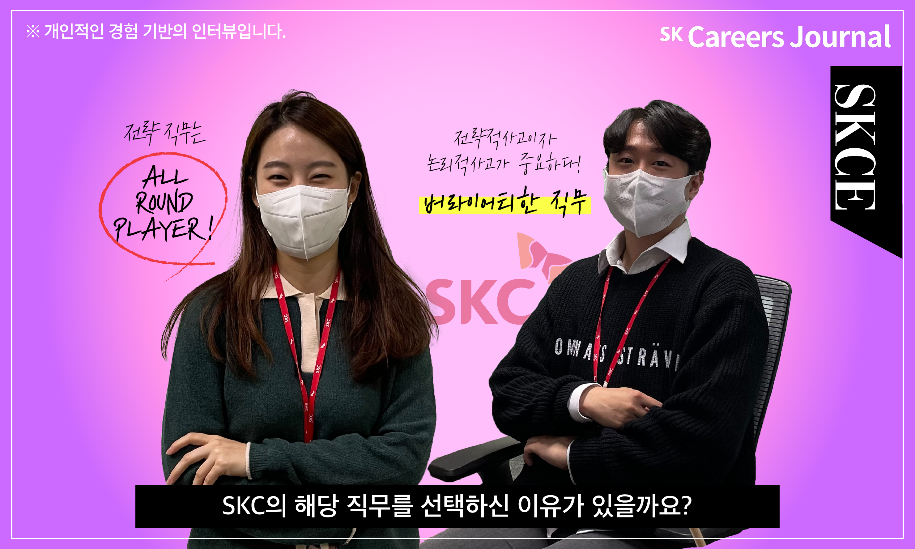 김선우 매니저님: 우선 직무를 확실하게 전략쪽으로 결정했었고, SK그룹 전반에 대한 선호도가 기본적으로 있었습니다. 전략직무에서 신입이 빠르고 즐겁게 성장을 하려면 역동적으로 변화하는 기업이야 합니다. SK그룹이 그런 경향이 있었고, SKC가 그 중에서도 포트폴리오를 빠르게, 성공적으로 바꾸고 있는 기업이었기에 배울 기회가 많겠다고 생각하여 선택하였습니다.