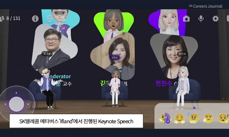 부회장님께서는 최근 개발된 AI 반도체 ‘사피온’과 ‘만약의 땅’이라는 의미를 가진 ‘이프랜드’에 대해 언급하는 등 반도체가 미치는 전 세계적 영향에 대해서도 말씀하셨으며, 앞으로 메타버스는 미래의 일하는 공간, 또는 소통하는 공간이 될 것이라 확신한다는 말을 덧붙이셨습니다. 결국 메타버스는 기술과 상상력의 결합과 협력이 중요하기 때문에 앞으로 많은 이들과 함께 교류하며 좋은 결과를 만들어낼 수 있기를 기대하셨습니다.