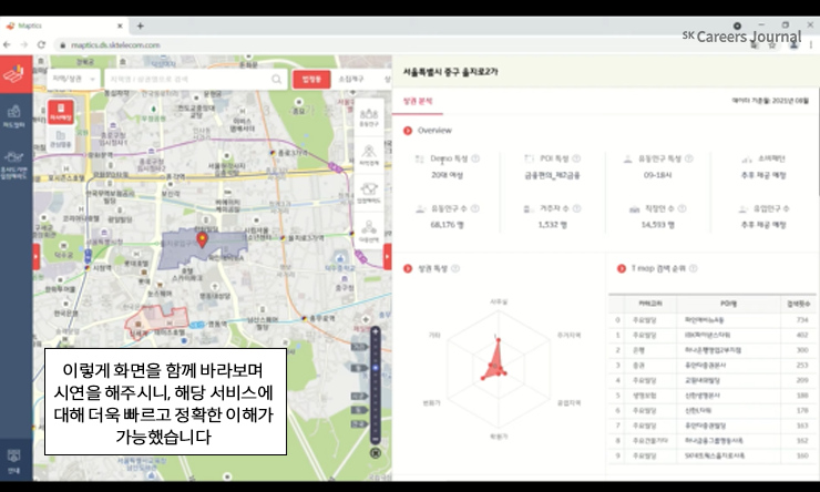 우선 시연형 전시에서 들여다볼 것은 SK텔레콤 cloud transformation center, cloud data application팀의 조성범 담당자님께서 소개하시는 ‘빅데이터 기반 지역 분석 서비스 MapTics’입니다. MaptTics는 Map-based Analytics의 줄임말로, web 기반의 상권 분석 서비스를 의미합니다.