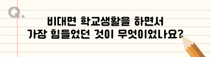 마지막으로 공부 외의 이야기인데, 새터(‘새내기 배움터’의 줄임말)에서 선배 역할을 해보고 싶었거든요. 제가 새내기일 때 선배, 동기들과 너무 재밌게 놀았던 기억이 있어서 그런지 연초마다 새터에 갈 생각으로 힘든 전공 공부를 버텼는데 지금 2년째 못 가고 있어서 많이 아쉽고 기운이 빠지네요. 비대면이나 대면 둘 다 공부로 받는 스트레스는 비슷한데 스트레스 해소할 것만 사라져서 더 힘들고 스트레스 받는 거 같아요.
