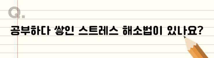친구들을 만나서 힘든 공부 얘기를 함께 하면서 서로 위안을 받아요. 서로 같은 상황에 있다 보니 길게 말하지 않아도 서로 깊게 공감하기 때문에 같이 있다는 것만으로 스트레스가 조금은 해소돼요. 그리고 따로 게임도 하면서 잠시 공부 생각을 접는 것도 스트레스 해소하는 데 도움이 되는 거 같아서 가끔 게임도 하며 스트레스를 해소해요.