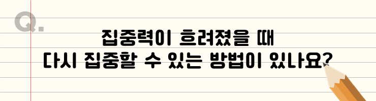 저는 집중력이 흐려졌을 때, 다시 집중하기 위해 공부하기 전에 껌 한 통을 사요. 공부 도중에 문제가 잘 안 풀려서 집중력이 흐려지거나 다른 생각이 들 때, 껌 한 개를 꺼내 씹으면 저 스스로 '다시 해보자'라는 마음가짐이 생겨요. 껌이 아니더라도 바깥 공기를 쐬거나 음료를 마신다든지 각자에게 맞는 방법으로 주위를 환기하는 방법을 찾으시면 도움이 될 거 같아요.