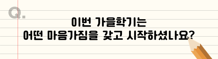 스스로 높은 성적을 받아야 한다는 강박이 생긴 거 같아요. 그래서 이번 학기에도 좋은 성적을 받아서 누적 학점이 떨어지지 않도록 최선을 다할 거예요. 또, 제가 아직 구체적인 진로를 결정하지 못했어요. 그래서 이번 가을학기에 여러 전공을 공부해보면서 관심 분야가 무엇인지 알게 되는 학기가 되었으면 좋겠어요.